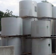 Large white cylindrical pressure vessel with a rounded top, mounted on four legs, featuring a top opening and a side outlet